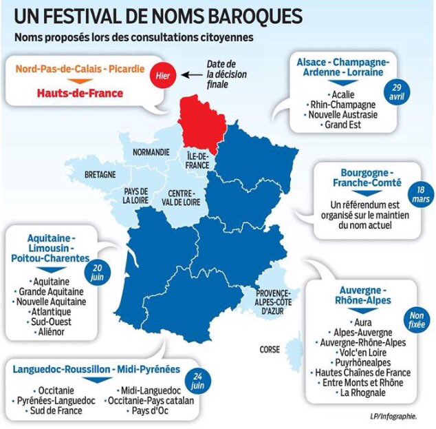 François Hollande government decided to reduce the number of regions from 22 to 13. Some of the regions have stayed the same whereas some others have been amalgamated, for these, new names have to be chosen by 1st July.